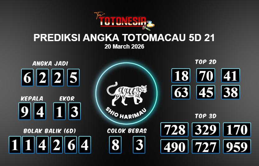 Prediksi TOTOMACAU 5D 21 adalah perhitungan nomor togel unggulan dari agen suhu togel yang menyajikan angka prediksi paling akurat, sehingga memberikan banyak keuntungan saat bermain di pasar togel TOTOMACAU 5D 21 . TotoNesia adalah prediksi dengan rasio kemenangan tertinggi di Indonesia. Sebagai penyedia togel yang dapat dipercaya, kami bertekad untuk memberikan ramalan togel yang handal dengan hadiah terbesarnya. Maka dari itu, jangan sampai terlewatkan prediksi bandar togel dengan hadiah terbanyak bet 100 dari pasar togel terbaik TOTOMACAU 5D 21 Daftar sekarang juga di bandar.