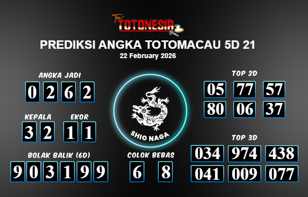 Prediksi TOTOMACAU 5D 21 adalah perhitungan nomor togel unggulan dari agen suhu togel yang menyajikan angka prediksi paling akurat, sehingga memberikan banyak keuntungan saat bermain di pasar togel TOTOMACAU 5D 21 . TotoNesia adalah prediksi dengan rasio kemenangan tertinggi di Indonesia. Sebagai penyedia togel yang dapat dipercaya, kami bertekad untuk memberikan ramalan togel yang handal dengan hadiah terbesarnya. Maka dari itu, jangan sampai terlewatkan prediksi bandar togel dengan hadiah terbanyak bet 100 dari pasar togel terbaik TOTOMACAU 5D 21 Daftar sekarang juga di bandar.