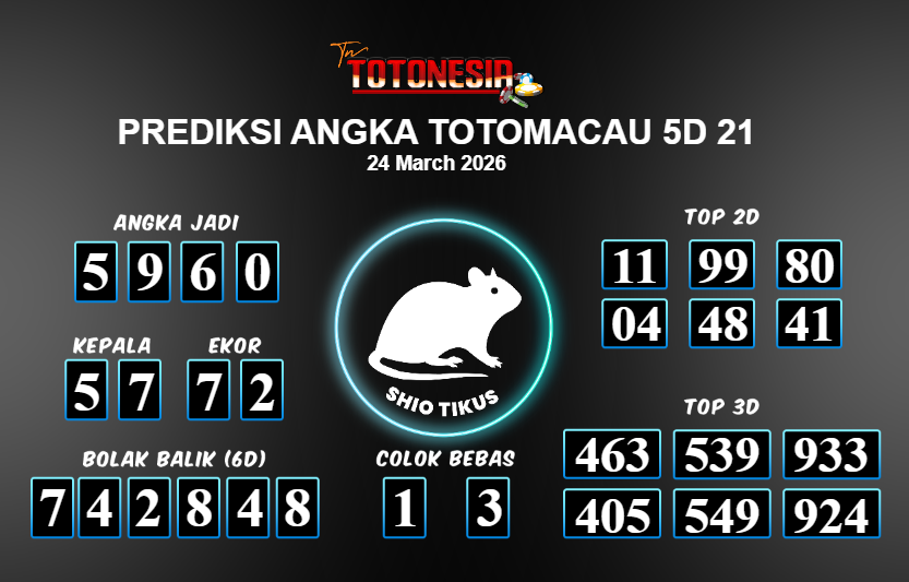 Prediksi TOTOMACAU 5D 21 adalah perhitungan nomor togel unggulan dari agen suhu togel yang menyajikan angka prediksi paling akurat, sehingga memberikan banyak keuntungan saat bermain di pasar togel TOTOMACAU 5D 21 . TotoNesia adalah prediksi dengan rasio kemenangan tertinggi di Indonesia. Sebagai penyedia togel yang dapat dipercaya, kami bertekad untuk memberikan ramalan togel yang handal dengan hadiah terbesarnya. Maka dari itu, jangan sampai terlewatkan prediksi bandar togel dengan hadiah terbanyak bet 100 dari pasar togel terbaik TOTOMACAU 5D 21 Daftar sekarang juga di bandar.