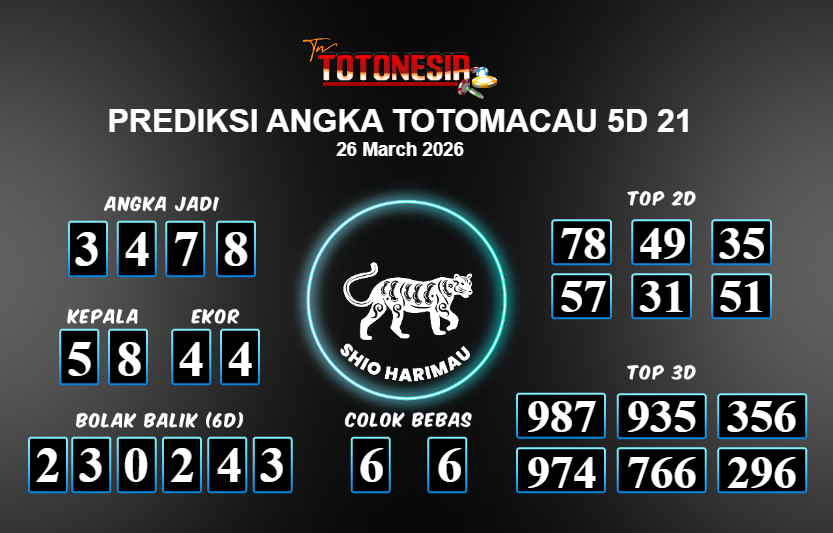 Prediksi TOTOMACAU 5D 21 adalah perhitungan nomor togel unggulan dari agen suhu togel yang menyajikan angka prediksi paling akurat, sehingga memberikan banyak keuntungan saat bermain di pasar togel TOTOMACAU 5D 21 . TotoNesia adalah prediksi dengan rasio kemenangan tertinggi di Indonesia. Sebagai penyedia togel yang dapat dipercaya, kami bertekad untuk memberikan ramalan togel yang handal dengan hadiah terbesarnya. Maka dari itu, jangan sampai terlewatkan prediksi bandar togel dengan hadiah terbanyak bet 100 dari pasar togel terbaik TOTOMACAU 5D 21 Daftar sekarang juga di bandar.