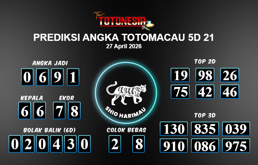 Prediksi TOTOMACAU 5D 21 adalah perhitungan nomor togel unggulan dari agen suhu togel yang menyajikan angka prediksi paling akurat, sehingga memberikan banyak keuntungan saat bermain di pasar togel TOTOMACAU 5D 21 . TotoNesia adalah prediksi dengan rasio kemenangan tertinggi di Indonesia. Sebagai penyedia togel yang dapat dipercaya, kami bertekad untuk memberikan ramalan togel yang handal dengan hadiah terbesarnya. Maka dari itu, jangan sampai terlewatkan prediksi bandar togel dengan hadiah terbanyak bet 100 dari pasar togel terbaik TOTOMACAU 5D 21 Daftar sekarang juga di bandar.