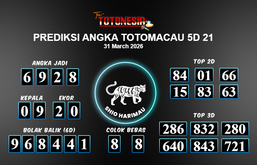 Prediksi TOTOMACAU 5D 21 adalah perhitungan nomor togel unggulan dari agen suhu togel yang menyajikan angka prediksi paling akurat, sehingga memberikan banyak keuntungan saat bermain di pasar togel TOTOMACAU 5D 21 . TotoNesia adalah prediksi dengan rasio kemenangan tertinggi di Indonesia. Sebagai penyedia togel yang dapat dipercaya, kami bertekad untuk memberikan ramalan togel yang handal dengan hadiah terbesarnya. Maka dari itu, jangan sampai terlewatkan prediksi bandar togel dengan hadiah terbanyak bet 100 dari pasar togel terbaik TOTOMACAU 5D 21 Daftar sekarang juga di bandar.