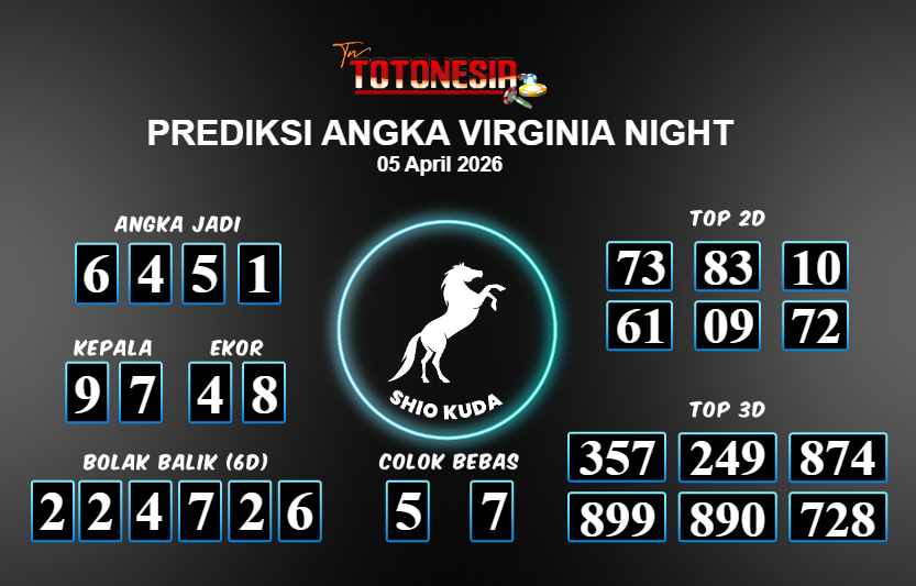 Prediksi VIRGINIA NIGHT adalah perhitungan nomor togel unggulan dari agen suhu togel yang menyajikan angka prediksi paling akurat, sehingga memberikan banyak keuntungan saat bermain di pasar togel VIRGINIA NIGHT . TotoNesia adalah prediksi dengan rasio kemenangan tertinggi di Indonesia. Sebagai penyedia togel yang dapat dipercaya, kami bertekad untuk memberikan ramalan togel yang handal dengan hadiah terbesarnya. Maka dari itu, jangan sampai terlewatkan prediksi bandar togel dengan hadiah terbanyak bet 100 dari pasar togel terbaik VIRGINIA NIGHT Daftar sekarang juga di bandar.