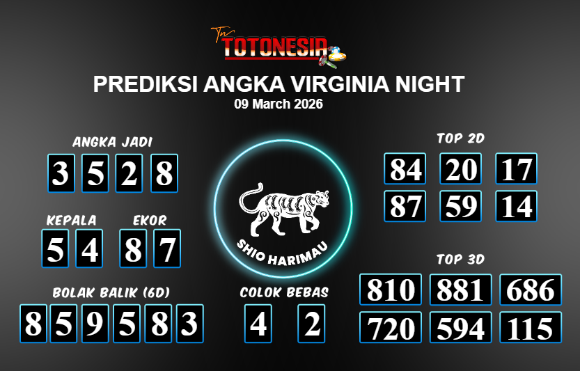 Toto Nesia : Bocoran Prediksi Togel VIRGINIA NIGHT Tanggal 09 MARET 2026