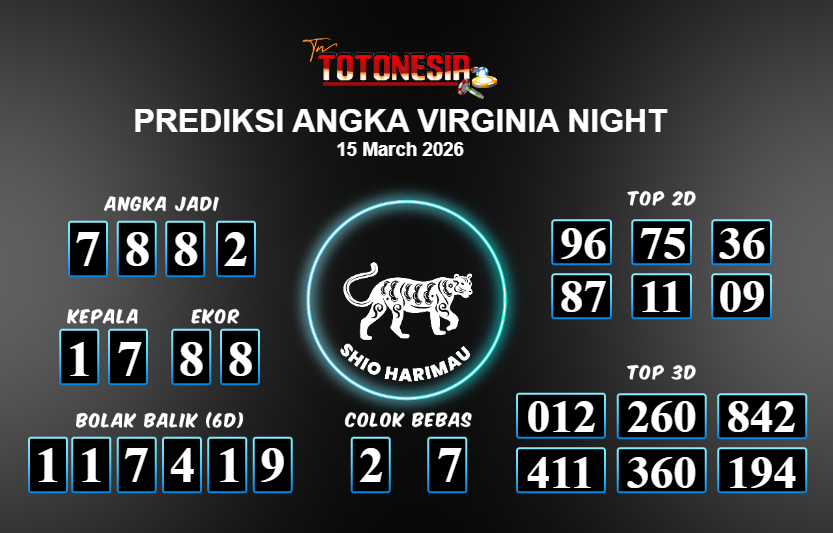 Prediksi VIRGINIA NIGHT adalah perhitungan nomor togel unggulan dari agen suhu togel yang menyajikan angka prediksi paling akurat, sehingga memberikan banyak keuntungan saat bermain di pasar togel VIRGINIA NIGHT . TotoNesia adalah prediksi dengan rasio kemenangan tertinggi di Indonesia. Sebagai penyedia togel yang dapat dipercaya, kami bertekad untuk memberikan ramalan togel yang handal dengan hadiah terbesarnya. Maka dari itu, jangan sampai terlewatkan prediksi bandar togel dengan hadiah terbanyak bet 100 dari pasar togel terbaik VIRGINIA NIGHT Daftar sekarang juga di bandar.