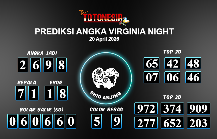 Prediksi VIRGINIA NIGHT adalah perhitungan nomor togel unggulan dari agen suhu togel yang menyajikan angka prediksi paling akurat, sehingga memberikan banyak keuntungan saat bermain di pasar togel VIRGINIA NIGHT . TotoNesia adalah prediksi dengan rasio kemenangan tertinggi di Indonesia. Sebagai penyedia togel yang dapat dipercaya, kami bertekad untuk memberikan ramalan togel yang handal dengan hadiah terbesarnya. Maka dari itu, jangan sampai terlewatkan prediksi bandar togel dengan hadiah terbanyak bet 100 dari pasar togel terbaik VIRGINIA NIGHT Daftar sekarang juga di bandar.