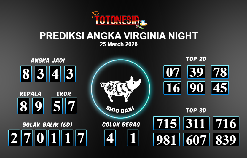 Prediksi VIRGINIA NIGHT adalah perhitungan nomor togel unggulan dari agen suhu togel yang menyajikan angka prediksi paling akurat, sehingga memberikan banyak keuntungan saat bermain di pasar togel VIRGINIA NIGHT . TotoNesia adalah prediksi dengan rasio kemenangan tertinggi di Indonesia. Sebagai penyedia togel yang dapat dipercaya, kami bertekad untuk memberikan ramalan togel yang handal dengan hadiah terbesarnya. Maka dari itu, jangan sampai terlewatkan prediksi bandar togel dengan hadiah terbanyak bet 100 dari pasar togel terbaik VIRGINIA NIGHT Daftar sekarang juga di bandar.
