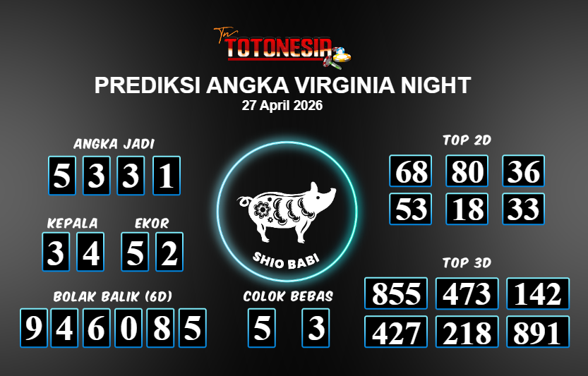 Prediksi VIRGINIA NIGHT adalah perhitungan nomor togel unggulan dari agen suhu togel yang menyajikan angka prediksi paling akurat, sehingga memberikan banyak keuntungan saat bermain di pasar togel VIRGINIA NIGHT . TotoNesia adalah prediksi dengan rasio kemenangan tertinggi di Indonesia. Sebagai penyedia togel yang dapat dipercaya, kami bertekad untuk memberikan ramalan togel yang handal dengan hadiah terbesarnya. Maka dari itu, jangan sampai terlewatkan prediksi bandar togel dengan hadiah terbanyak bet 100 dari pasar togel terbaik VIRGINIA NIGHT Daftar sekarang juga di bandar.