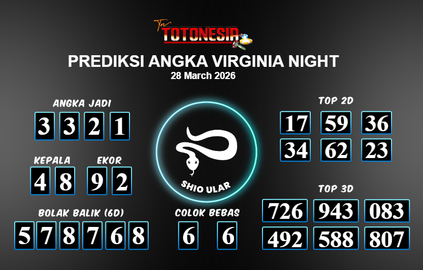 Prediksi VIRGINIA NIGHT adalah perhitungan nomor togel unggulan dari agen suhu togel yang menyajikan angka prediksi paling akurat, sehingga memberikan banyak keuntungan saat bermain di pasar togel VIRGINIA NIGHT . TotoNesia adalah prediksi dengan rasio kemenangan tertinggi di Indonesia. Sebagai penyedia togel yang dapat dipercaya, kami bertekad untuk memberikan ramalan togel yang handal dengan hadiah terbesarnya. Maka dari itu, jangan sampai terlewatkan prediksi bandar togel dengan hadiah terbanyak bet 100 dari pasar togel terbaik VIRGINIA NIGHT Daftar sekarang juga di bandar.